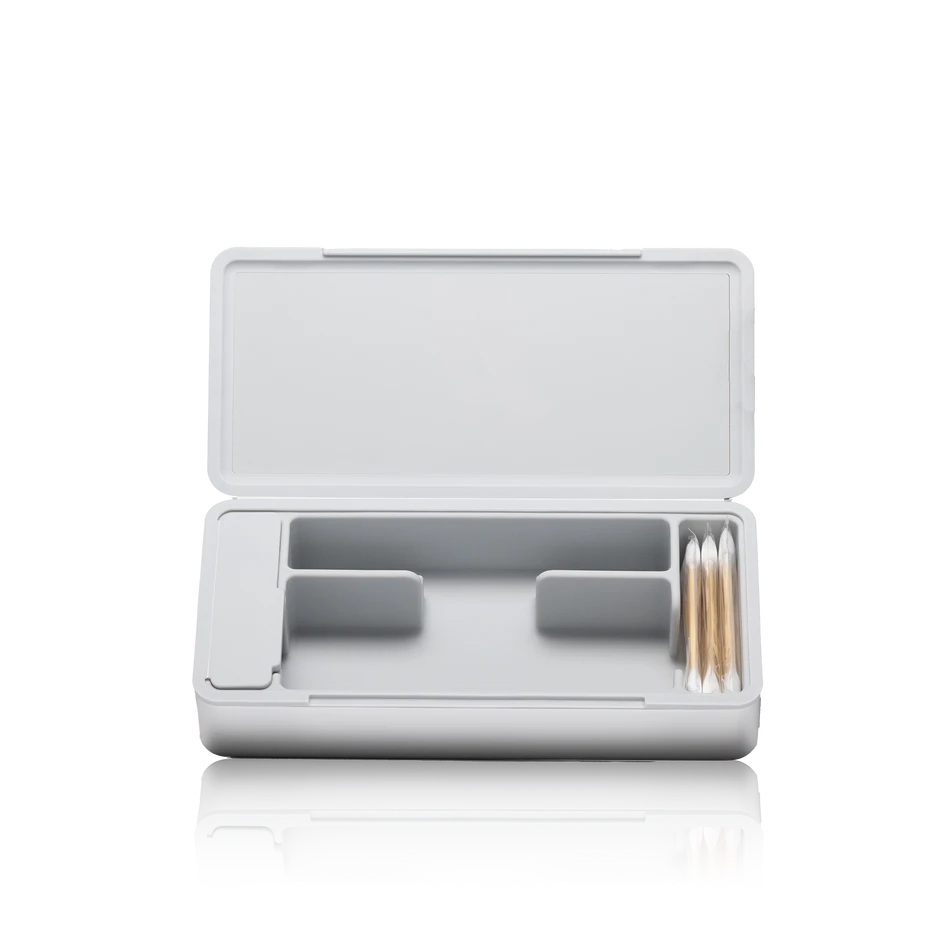 The Travel Case keeps your stash organized. Featuring a ridged hard aluminum exterior with a magnetic lid closure and soft silicone inside to reduce rattling, the Travel Case has room for a Pivot + Hot Knife, up to 3 jars, cotton swabs, a covered section for trash, and anything else you might need.